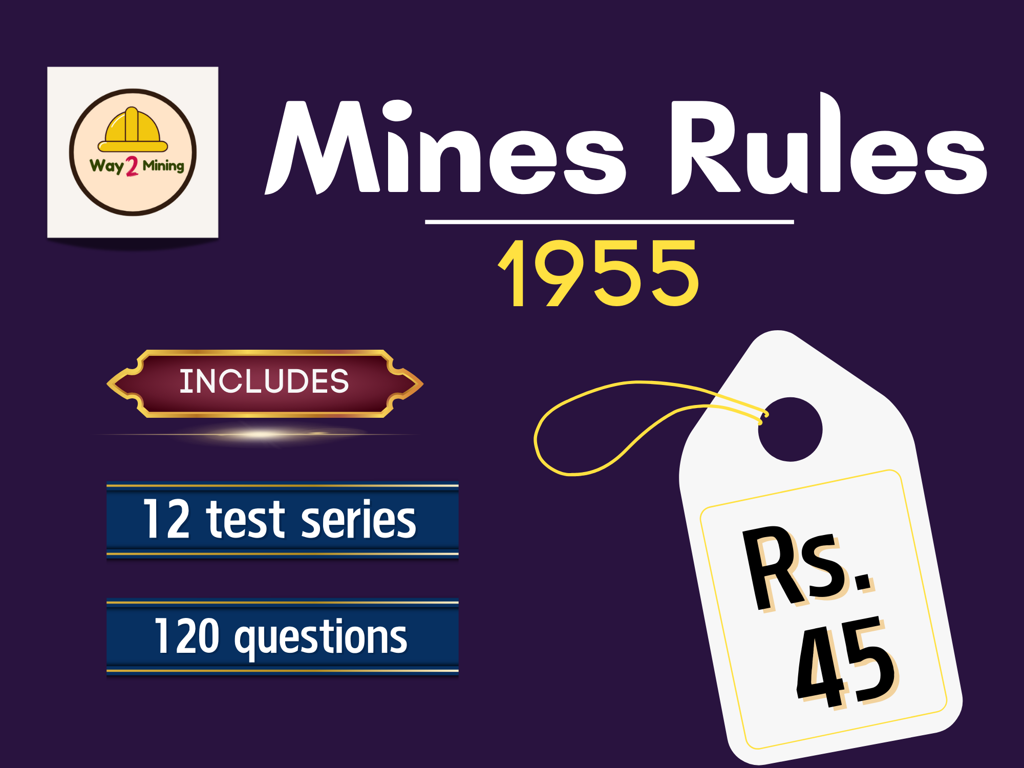MCQ's - Mines Rules'1955 1. Mines Rules MCQ's Booklet 01 (60 Questions Total) 2. Mines Rules MCQ's Booklet 02 (60 Questions Total) 3. Twelve Nos of Test (10 Questions in each test & 10 Attempts for each test ) 4. Short Notes for all Rules